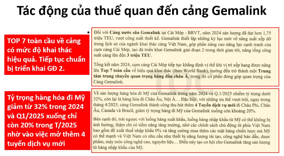 Đối với cảng Gemalink, tỷ trọng hàng hóa đi Mỹ đã giảm từ 32% trong 2024 và Q1/2025 xuống chỉ còn 20% trong T4/2025 nhờ vào việc mở thêm 4 tuyến dịch vụ mới đi Châu Phi, Châu Âu, Canada và Brazil. Mặc dù tỷ lệ hàng hóa đi Mỹ có giảm, nhưng đây vẫn là một tỷ lệ tương đối cao, do đó nếu Việt Nam không đàm phán thành công để hạ thuế xuống mức thấp hơn thì điều này cũng sẽ có có tác tương đối đáng kể đến GMD.