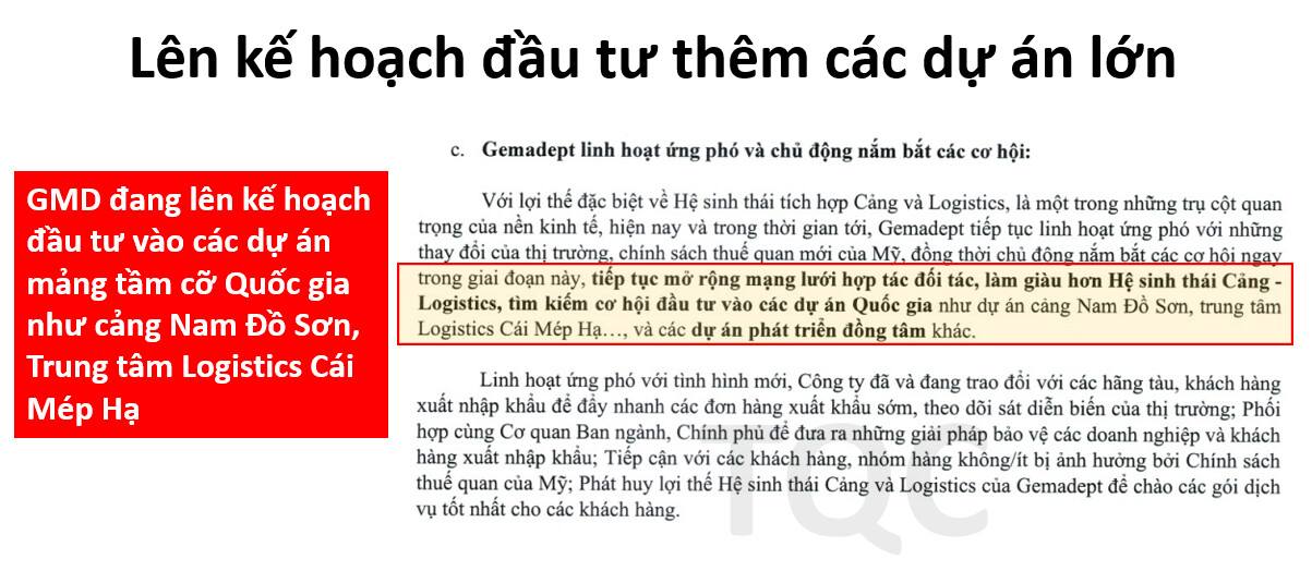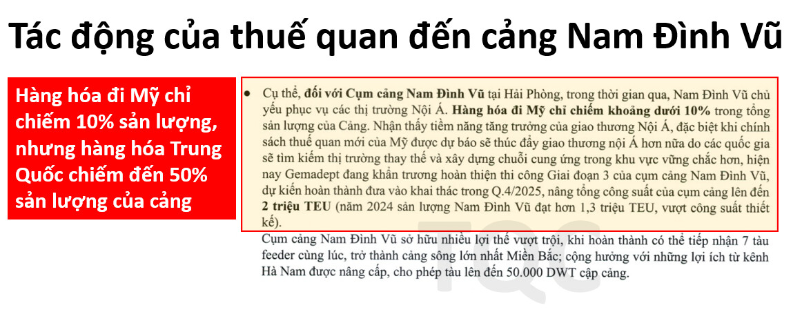Đối với cảng Nam Đình Vũ, hàng hóa đi Mỹ chỉ chiếm 10% sản lượng, do đó mức độ ảnh hưởng trực tiếp là không quá đáng kể. Nhưng hàng hóa Trung Quốc chiếm đến 50% sản lượng hàng hóa thông qua cảng Nam Đình Vũ, cho nên vẫn còn tồn tại nhiều rủi ro gián tiếp. Bất chấp những khó khăn về vấn đề thuế quan, BLĐ GMD vẫn đặt mục tiêu hoàn thành giai đoạn 3 của cảng Nam Đình Vũ trong 2025.