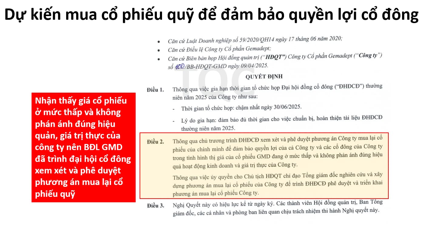 Tại ngày 09/04/2025, nhận thấy giá cổ phiếu ở mức thấp và không phán ánh đúng hiệu quản, giá trị thực của công ty nên BĐL GMD đã trình đại hội cổ đông xem xét và phê duyệt phương án mua lại cổ phiếu quỹ, điều này sẽ giúp đảm bảo quyền lợi của các cổ đông.
