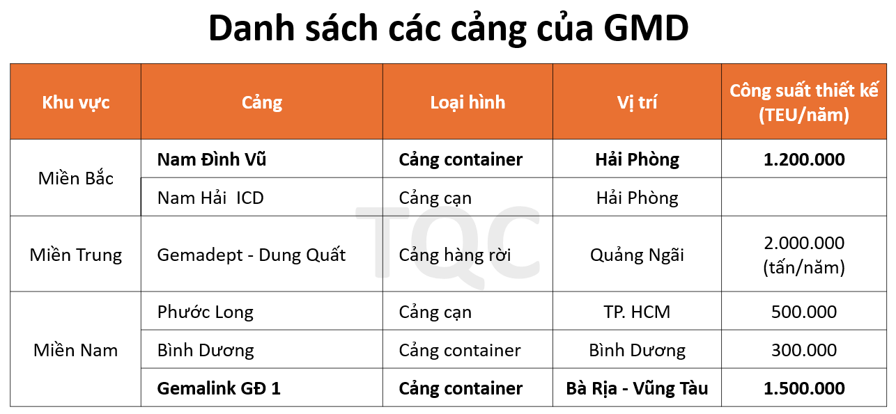 GMD đang sở hữu hệ thống cảng tại cả 3 khu vực Bắc, Trung, Nam của Việt Nam. Nam Đình Vũ và Gemalink là 2 cảng có quy mô lớn nhất của GMD.