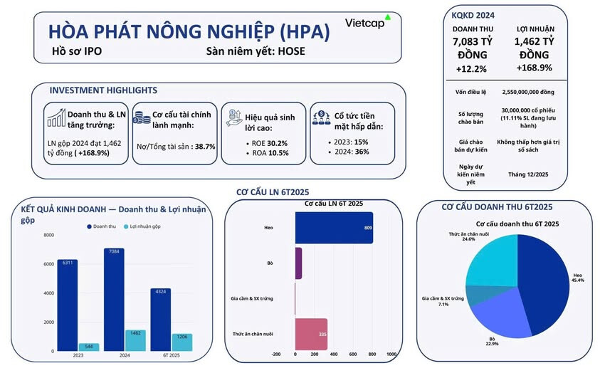 Cuối cùng, câu chuyện định giá: Mức lợi nhuận 6 tháng đầu năm 2025 quanh 1.200 tỷ VNĐ sau thuế là khoảng 939 tỷ VNĐ; mức lợi nhuận cả năm ước khoảng 1.800-2.000 tỷ VNĐ. Mức EPS dự kiến năm nay của HPA quanh 6.000 – 7.000 VNĐ/1 cổ phiếu, thuộc top rất cao trong ngành. Mức P/E trung bình những công ty chăn nuôi trên thị trường đang quanh 9 lần. Hiện nay, mọi thông tin giá mới dừng lại ở mức không thấp hơn giá trị sổ sách quanh 11.800 VNĐ. Còn phải đợi giá chào bán chính thức, nhưng với cơ bản và tiềm năng như vậy, kèm theo mức giá chào bán hợp lý, thì HPA sẽ là một deal rất đáng quan tâm giai đoạn cuối năm nay.