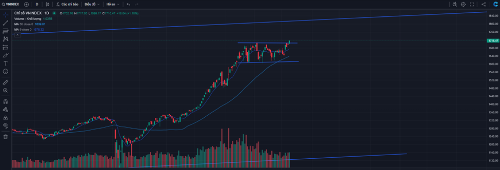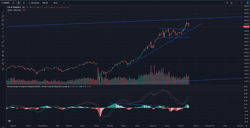 Sau thông tin tích cực về việc nâng hạng thị trường chứng khoán Việt Nam lên mới nổi, chỉ số VN-Index đã có nhịp vượt qua 1700 điểm. Đây là tín hiệu tích cực cho thấy VN-Index đã xác lập mặt bằng giá mới. Thời gian tới, khả năng có nhịp chỉnh về quanh 1700 điểm kiểm định rất cao. Nếu gãy qua lại 1700 điểm, sẽ có nhịp về lại 1650 điểm. Khả năng cao, mình đánh giá thị trường sau khi kiểm định xong quanh 1700 điểm sẽ tiếp tục xu hướng tăng đón báo cáo tài chính Q3/2025 tới chuẩn bị công bố. Với mức tăng trưởng 8,22% GDP, khả năng các công ty trên sàn cũng sẽ ghi nhận mức tăng trưởng tốt về lợi nhuận. Mục tiêu tiếp theo quanh 1800 điểm.
