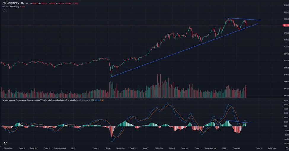 Thị trường điều chỉnh mạnh trở lại sau thông tin Mỹ và Israel tấn công Iran. Kèm theo đó, sự sụt giảm sâu của nhóm cổ phiếu họ Vin đã kéo chỉ số về lại quanh vùng trend trung hạn, khoảng 1780 - 1800 điểm. Trong thời gian tới, khả năng cao thị trường sẽ kiểm định lại mốc 1780 - 1800 điểm. Mình kỳ vọng tại vùng này, thị trường sẽ tích lũy tạo đáy và hồi phục trở lại. Ở kịch bản xấu hơn, thị trường có thể lùi về mức 1750 điểm. Giai đoạn này, thị trường sẽ có sự phân hóa mạnh mẽ giữa các nhóm cổ phiếu.