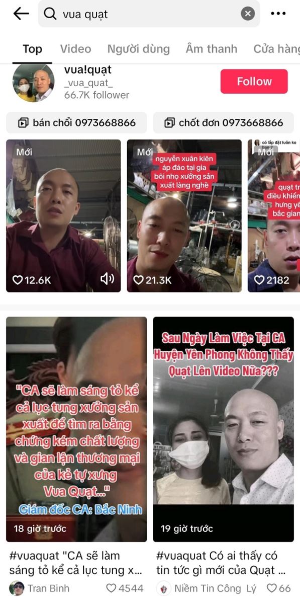 Ở một diễn biến khác liên quan tới hoạt động sản xuất, kinh doanh sản phẩm quạt của tài khoản Tiktok “vua quạt”, trả lời báo chí, ông Nguyễn Văn Giáo, Cục trưởng Cục Quản lý thị trường tỉnh Bắc Ninh cho biết, đơn vị nhận được nguồn tin báo phản ánh về hoạt động sản xuất, kinh doanh quạt điện của tài khoản Tiktok “Vua quạt” có dấu hiệu kém chất lượng nên đã tổ chức phối hợp với cơ quan liên quan để xác minh, kiểm tra đảm bảo quyền lợi cho người tiêu dùng.