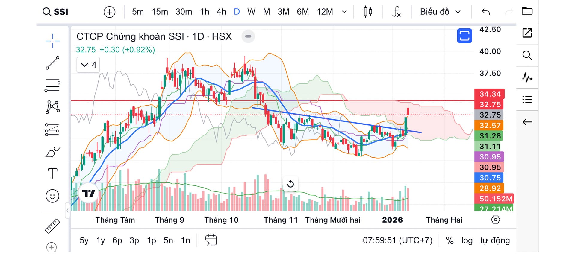 Ngắn hạn SSI phá vỡ neckline mẫu hình VDV ngược với phiên TÍM hôm thứ 2, tăng mạnh mẽ tiến về cận cản quan trọng. Phiên hôm qua đà tăng tiếp diễn nhưng thu dần nến vào band, thanh khoản vẫn lớn. Trạng thái BBS “lùa lệnh, gom hết cung” tiếp diễn, chiều nay hàng phiên BỨT TỐC về
