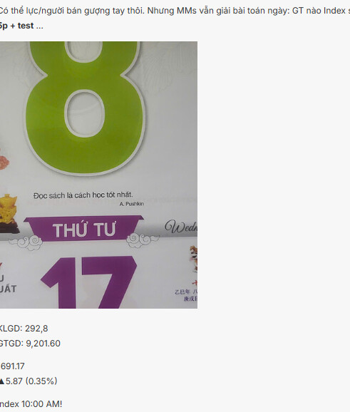 “Còn diễn biến thị trường phiên nay thì em có nói ở trên, nhóm a V đang đè điểm số, hãm đà hưng phấn. Nhưng bank Big4 để ý VCB BID CTG đang bắt nhịp, xung lực mạnh dần lên và về chiều sẽ kích hoạt và dùng tối đa khi muốn kéo VNI vượt hẳn 1700. Nên từ giờ tới khi VNI vượt hẳn 1700, tập trung để ý bank big4 có phim hay. Nhỏ lẻ ai cầm tiền đứng ngoài đợi tin ra nhiều lắm, nên không nên lấy suy nghĩ cá nhân áp đặt Chẳng qua canh điểm mua khi nào đây nè. Vượt 1700 tự khắc thấy nổ thanh khoản Ông nào cầm tiền đợi VNI chỉnh về 1400-1500, nhưng nó kéo vượt 1700 giỏi đứng ngoài nhìn VNI tiến về 1900 trong 2-3 tháng tới không? Sẽ có 1 số kiên quyết đứng ngoài, nhưng phần lớn chịu không nổi đâu.”