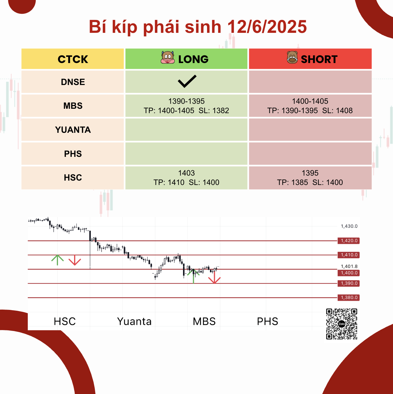 - Kịch bản Short: Giá thủng hỗ trợ 1395. Điểm vào lệnh: 1395. Mục tiêu: 1385. Điểm cắt lỗ: > 1400 Nguồn: https://phaisinh.online/2025/06/11/goc-nhin-ctck-ban-tin-phai-sinh-12-6-2025/