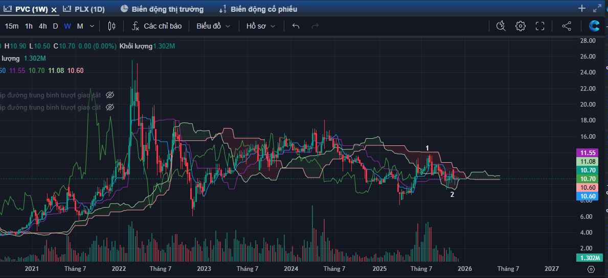 - Kháng cự và hỗ trợ: Các nến khung ngày phản ứng với vùng giá 11.3, đây là kháng cự tiếp theo cần chú ý với PVC, nếu giá có điều chỉnh hỗ trợ sẽ ở mức giá 9.8 - 10