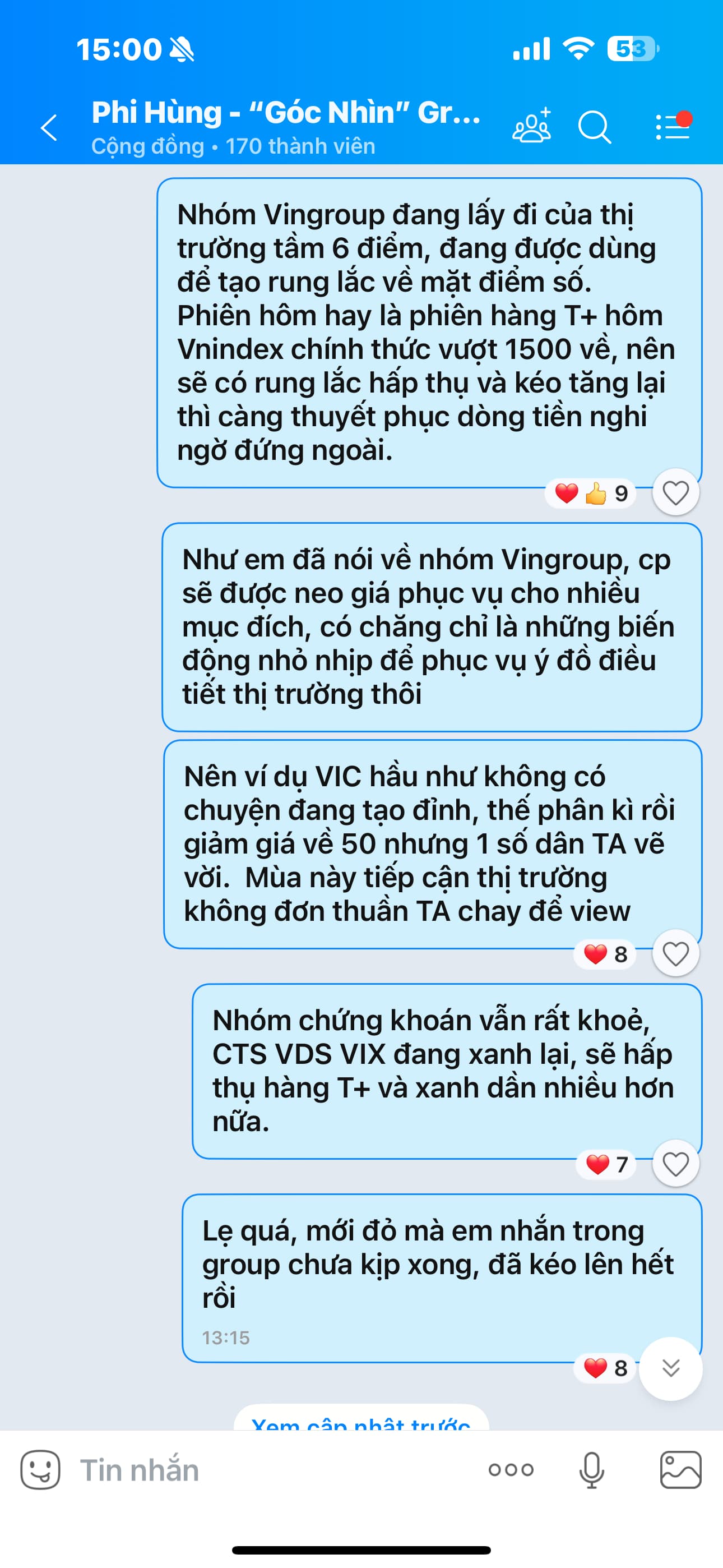 Chúc mừng tất cả anh chị! Cuối cùng VNINDEX cũng đóng cửa chính thức vượt 1500, với sự tăng điểm mạnh mẽ và mức độ Lan Toả dòng tiền rất tích cực, nhà đầu tư ngay cả ít ngó bảng điện cũng ngày càng cảm nhận dần sức nóng của Đại Sóng Nâng Hạng. Thị trường giai đoạn này giao dịch rất hay, vài phiên vừ rồi Test quanh 1500,không ít nhà đầu tư hay “chiên da” đều cảnh báo thị trường Tạo Đỉnh và chuẩn bị giảm sâu, các phiên rung lắc tạo thế phân kì nhỏ và sau đó chỉnh nhẹ càng khiến họ tự tin hơn. Nhưng bám nhịp xuyên suốt dòng chảy thị trường thì thấy rõ bức tranh hơn, sau các phiên rung lắc test 1500, thì phiên nay chính thức vượt 1500 sẽ càng củng cố sức mạnh và HÚT THÊM TIỀN CỦA NHÀ ĐẦU TƯ ĐANG ĐỨNG NGOÀI, vì họ thấy vượt 1500 thuyết phục, đây là lúc thị trường bước vào nhịp tăng nước rút ngắn hạn với độ cuốn rất mạnh.!
