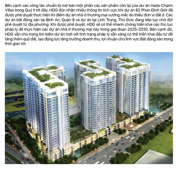 Nói chung khó khăn nhất của HDG cũng đã qua, với giả dịnh thị trường BDS chưa nhiều khởi sắc, yếu tố Vĩ mô chưa có nhiều thuận lợi thì với ln từ mảng điện cũng đủ giúp HDG vượt qua khó khăn khác với các cp bds khác