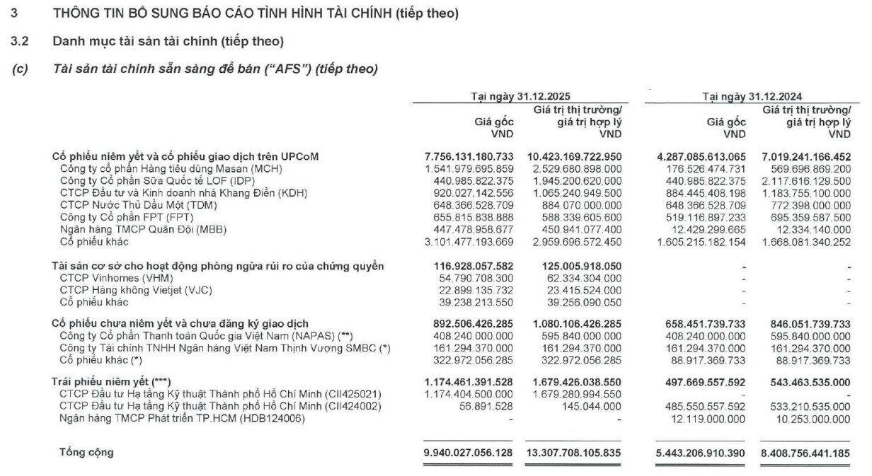 Giá trị tài sản tài chính sẵn sàng để bán (AFS) của VCI đang cho thấy hiệu suất sinh lời đáng kinh ngạc: