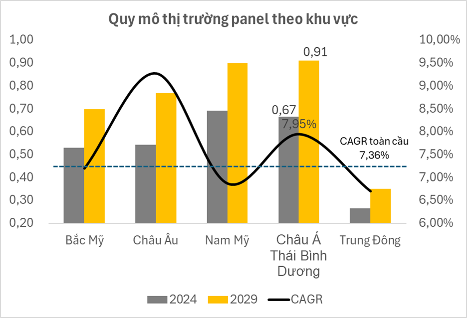 Trong đó, châu Á Thái Bình Dương được dự báo sẽ tăng trưởng với tốc độ 7,95% nhanh hơn mặt bằng chung (7,36%) và trở thành thị trường tiêu thụ panel lớn nhất thế giới, với quy mô khoảng 0,91 tỷ USD vào năm 2029.