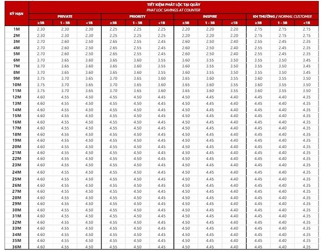 Biểu lãi suất tiết kiệm dành cho khách hàng thường và hội viên Inspire tại Ngân hàng TMCP Kỹ thương Việt Nam (Techcombank) đang được triển khai trong phạm vi 2,3 - 4,7%, áp dụng cho kỳ hạn 1 - 36 tháng, lãi cuối kỳ.