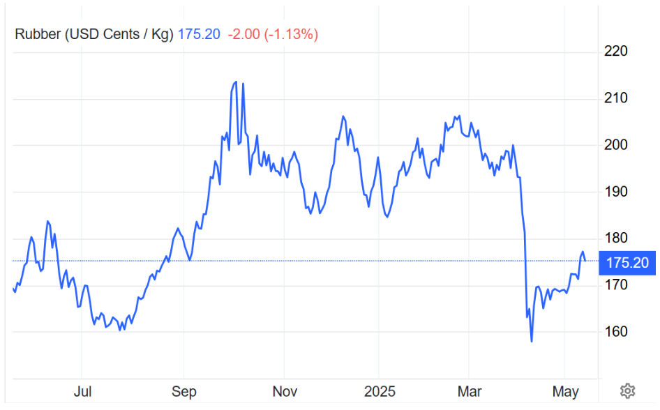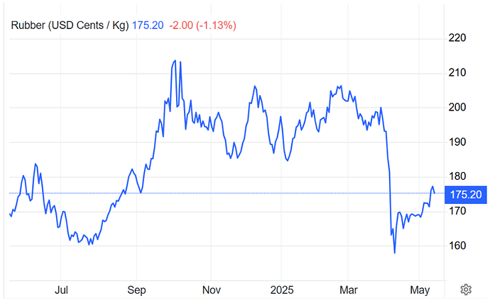 Cụ thể, trong giai đoạn tháng 4 vừa qua, giá cao su đã có đợt sụt giảm mạnh, chỉ còn $158/kg. Việc áp thuế 25% với ôtô nhập khẩu vào Mỹ đã làm dấy lên lo ngại về nhu cầu suy yếu của ngành oto. Với con số lên đến 63,4% lốp xe được bán ở Mỹ năm 2024, đa phần được nhập khẩu từ các quốc gia là Thái Lan, Indo, Việt Nam, Hàn Quốc. Nếu Mỹ áp thuế khiến giá lốp xe tăng mạnh, các nhà kinh doanh cũng khó mạnh tay nhập hàng, khiến nhu cầu sụt giảm mạnh và từ đó ảnh hưởng tới giá cao su.