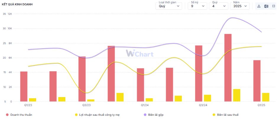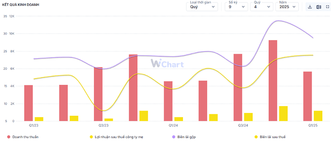 - Đi vào cụ thể, mảng cao su và sản phẩm cao su ghi nhận lãi gộp Q1/25 đạt 1,3 nghìn tỷ - tăng mạnh 58% yoy. Theo Tổng cục Hải quan, sản lượng xuất khẩu của cao su Việt Nam Trong quý vừa qua giảm 7,5% nhưng giá bán trung bình tăng 31,4% (đạt 1.926USD/tấn), phản ánh môi trường giá bán thuận lợi nên doanh thu của mảng này cũng cải thiện tốt.