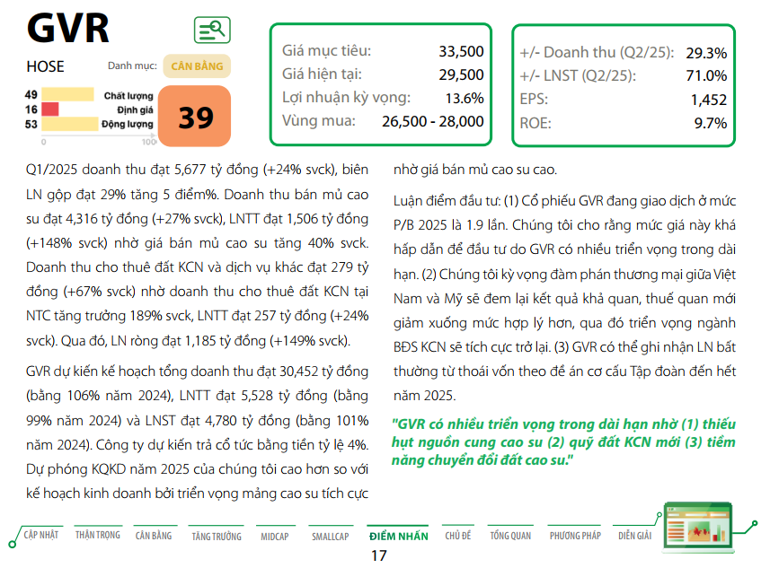 - Lý do chính cho việc điều chỉnh giá mục tiêu bao gồm: (1) điều chỉnh định giá mảng cao su và gỗ với kỳ vọng về giá bán trung bình (ASP) cao hơn, (2) nâng cao định giá đối với mảng bất động sản khu công nghiệp (KCN) nhờ vào việc bổ sung 24.000 ha đất dự kiến sẽ chuyển đổi thành KCN (so với dự báo trước đây là 21.000 ha) sau khi quy hoạch tổng thể của Đồng Nai và Bình Dương được thông qua, và (3) cập nhật thời gian mục tiêu từ cuối năm 2024 sang cuối năm 2025.