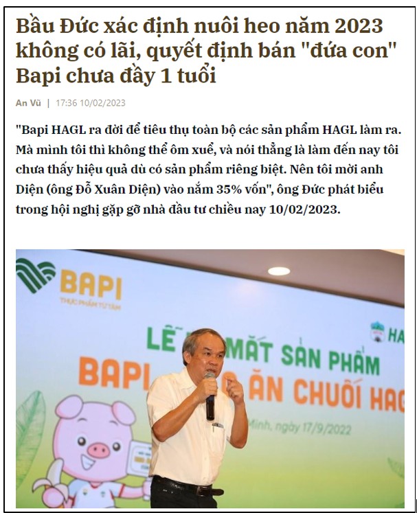 - Tuy nhiên, những điều đẹp đẽ đã qua đi. Trong buổi gặp gỡ nhà đầu tư vào ngày 10/02/2023, bầu Đức đã chia sẻ sẽ bán 35% cổ phần heo BAPI khi cho rằng năm 2023 là 1 năm khó khăn của các doanh nghiệp heo do giá heo thấp kỉ lục.