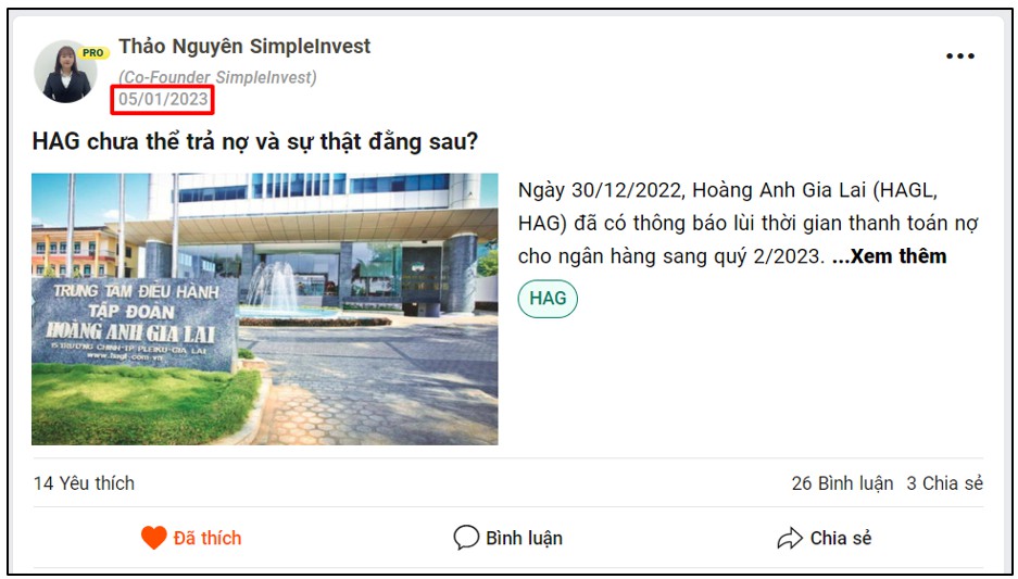 Và đúng như những gì SimpleInvest đã từng phân tích trong bài viết, cổ phiếu HAG kể từ ngày 5/1/2023 đến nay đã gần 1 tháng rưỡi vẫn chưa có dấu hiệu tăng giá. Thậm chí các nhà đầu tư có quan điểm ngược với SimpleInvest, bất chấp những phân tích để mua cổ phiếu tại thời điểm đó thì đến giai đoạn hiện tại, sau hơn 1 tháng cầm cổ phiếu, có thể đã lỗ trên 15%.