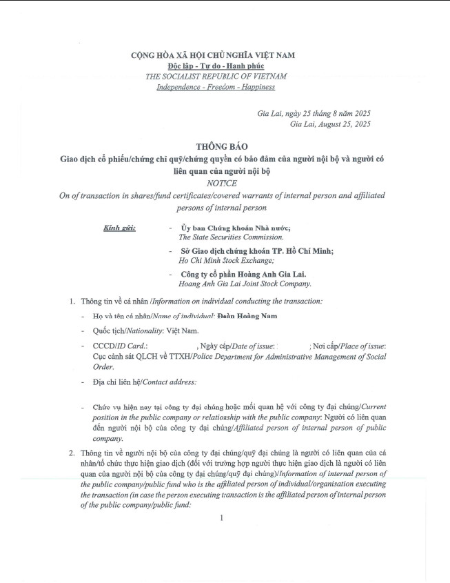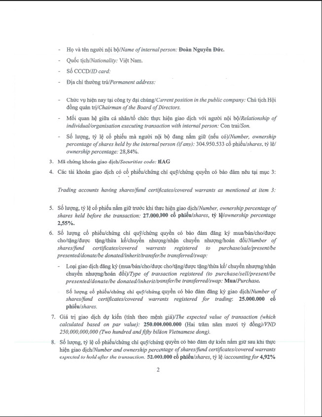 ông Đoàn Nguyên Nam - con trai bầu Đức công bố thông tin đăng ký mua thêm 25 triệu cổ phiếu HAG từ ngày 28/8 - 12/9 để nâng tỷ lệ sở hữu lên 4.92% vốn, tương đương 52 triệu cổ phần HAG