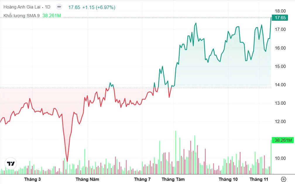 Phiên giao dịch cuối tuần qua (14/11), thị trường chứng khoán chứng kiến diễn biến bứt phá của cổ phiếu HAG nhà Hoàng Anh Gia Lai (HAGL), khi mã này đóng cửa trong trạng thái tăng trần, đạt 17.650 đồng/cổ phiếu. Đây cũng là mức giá cao nhất kể từ tháng 8/2015 của cổ phiếu này.