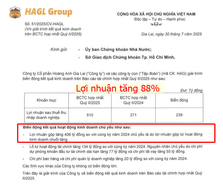 Trong Q2/2025, lợi nhuận hợp nhất sau thuế của HAG là 510 tỷ, tăng 88% so với cùng kỳ, chủ yếu là nhờ vào mảng kinh doanh chuối.