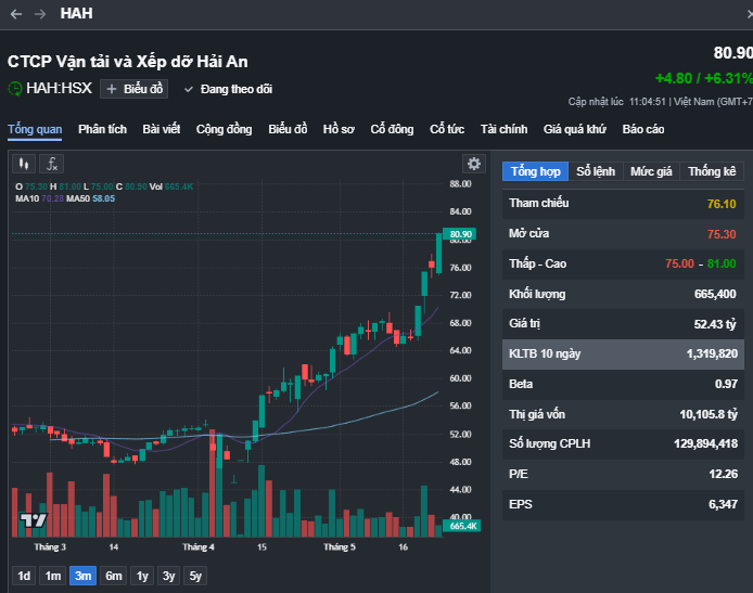 - Cổ phiếu HAH tăng 46.5% chỉ trong chưa đầy một tháng, đạt 66,000 đồng/cp, mức cao kỷ lục.