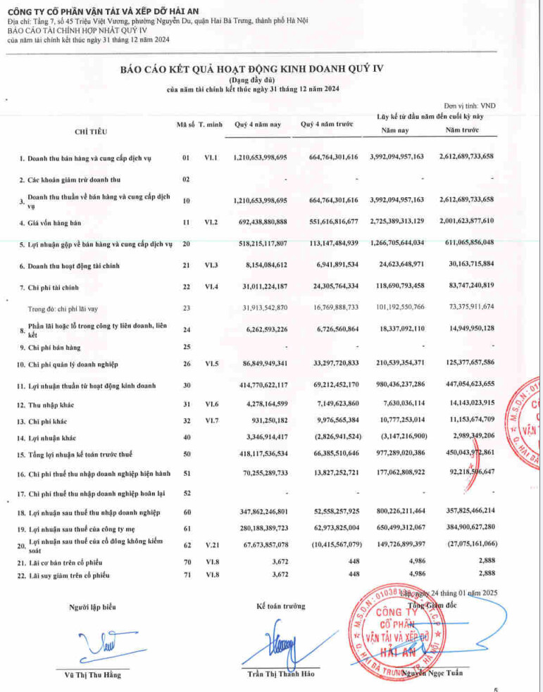 +Liên doanh: HAH bắt đầu hợp tác với hãng tàu lớn thứ 10 thế giời là ZIM trong 2023 và dự kiến Q4.2024 HAH hợp tác thêm với ONE hãng container lớn thứ 7 thế giới, trong đó ZIM phục vụ cho các tuyến xa ở Mỹ và EU, còn ONE thế mạnh trong khu vực Nội Á.