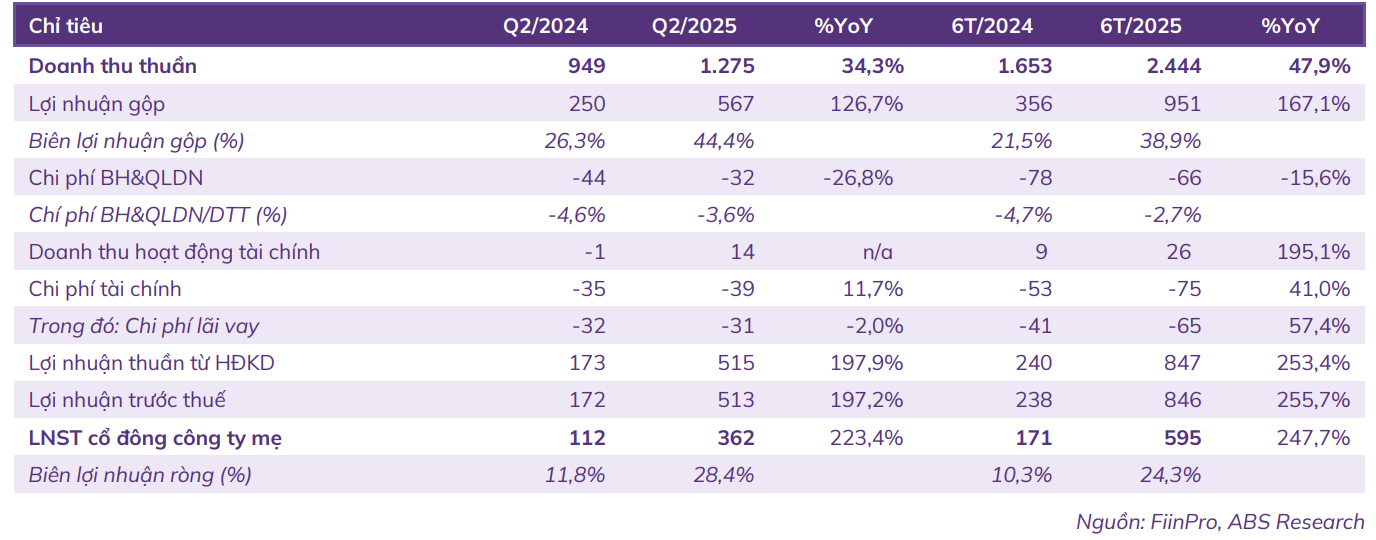 svck). Kết quả LNST của Cổ đông Công ty mẹ quý trong 6 tháng đạt 595 tỷ đồng (+247,7% svck), biên lợi nhuận ròng tăng mạnh lên 24,3% (+14,0 điểm phần trăm svck).