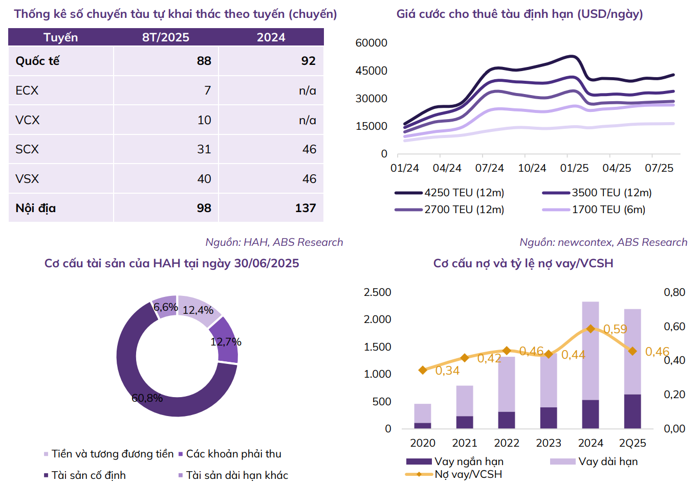 - (2) Hưởng lợi từ việc tái ký sớm khi giá cước định hạn còn neo cao. Hiện nay, mặc dù giá cước giao ngay đã giảm sâu hơn 60% kể từ vùng đỉnh từ Q3/2024, mức cước cho thuê định hạn vẫn đang neo cao, với giá cho thuê tàu 1.700 TEU (công suất chủ yếu các tàu của HAH) là ~27.000 USD/ngày (tăng xấp xỉ 16% so với cuối năm 2024) và tàu 3.500 TEU là ~34.000 USD/ngày (giảm 12% so với cuối năm 2024). Các yếu tố giúp giá cước neo cao bao gồm: (i) Độ trễ giữa hợp đồng định hạn và giao ngay; (ii) Khách thuê chấp nhận trả cao để đảm bảo chắc chắn có tàu và giảm rủi ro biến động, nhất là trong bối cảnh bất ổn địa chính trị và (iii) Nguồn cung hạn chế ở phân khúc tàu nhỏ. Theo đó, doanh thu từ hoạt động khai thác tàu định hạn của HAH trong năm 2025 có thể hưởng lợi nhờ: (i) Đã ký kết hợp đồng dài hạn 2 năm, đảm bảo nguồn doanh thu; (ii) Một số tàu hết hạn hợp đồng trong năm 2025 như Haian Charlie được hưởng lợi từ việc tái ký trong khi giá cước còn neo cao. Tuy nhiên, bước sang 2026, giá cước định hạn có thể sẽ chịu áp lực giảm theo xu hướng suy yếu chung của thị trường vận tải biển