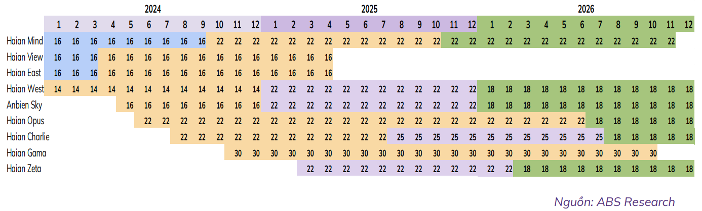 - (1) Bổ sung tàu mới công suất lớn, củng cố doanh thu định hạn. Trong năm 2025, HAH có thêm sự tham gia của Haian Zeta (bàn giao vào T2/2025) để khai thác các cảng ở Mỹ và Haian Gama (bàn giao T11/2024), hiện đang khai thác tuyến tại cảng Said (Ai Cập). Như vậy, đội tàu của HAH hiện bao gồm 7 tàu hoạt động cho thuê khai thác định hạn, giảm xuống từ 8 tàu do có Haian View và Haian East đã quay về hoạt động tự khai thác sau khi hoàn tất hợp đồng. Hầu hết các tàu đều đã tái kí trong năm 2024 với mức giá định hạn cao và sẽ hết hạn vào cuối năm 2025, theo đó, doanh thu từ mảng khai thác định hạn trong nửa sau năm 2025 ước tính cao hơn 29% svck.