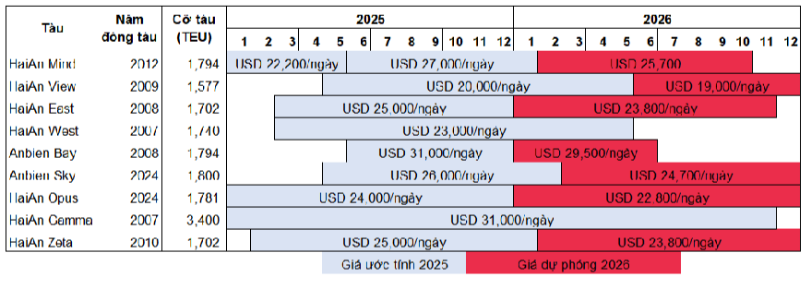 Với nhu cầu thuê tàu kích cỡ 1.700 – 1.800 TEU tăng mạnh khi các hãng tàu lớn gia tăng kích cỡ tàu, cũng như kết hợp với xu hướng front-loading trong nửa đầu năm 2025, giá cước cho thuê tàu đã tăng mạnh hơn 23% so với đầu năm trước khi bước vào xu hướng giảm dần khi các căng thẳng địa chính trị lắng xuống, cũng như xu hướng front loading không còn rầm rộ trong nửa cuối năm. Tận dụng được nhịp tăng vừa qua, phần lớn đội tàu cho thuê tàu của HAH được tái ký với mức cao hơn hợp đồng cũ. Theo tìm hiểu của chúng tôi, có khoảng 4 hợp đồng được tái ký với mức cho thuê cao hơn khoảng 22% so với trước đó, với thời gian cho thuê dự kiến kéo dài đến ít nhất T2/26. Chúng tôi cho rằng doanh thu của đội tàu cho thuê sẽ duy trì tốt đà tăng trưởng.