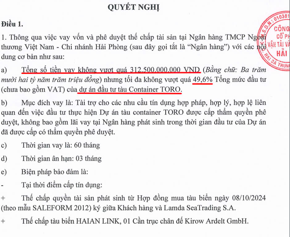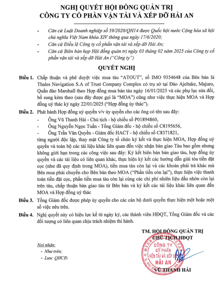 Trong đó, Công ty sẽ uỷ quyền cho ông Vũ Thanh Hải, Chủ tịch HĐQT, ông Nguyễn Ngọc Tuấn, Tổng giám đốc và ông Trần Văn Quyền, Giám đốc HACT thực hiện ký hợp đồng và thực hiện các thủ tục liên quan nhận chuyển nhượng tàu