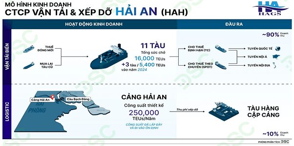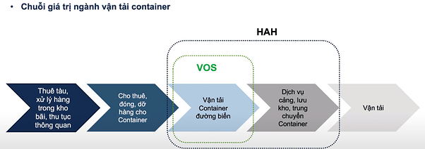 HAH chiếm lĩnh hai mắt xích quan trọng trong chuỗi giá trị của ngành vận tải container, bao gồm vận tải container đường biển và dịch vụ cảng, lưu kho, trung chuyển tại Cảng Hải An – nơi đã đi vào hoạt động ổn định với công suất được khai thác tối đa. Ngược lại, VOS (Công ty Cổ phần Vận tải Biển Việt Nam) chỉ tập trung vào mảng vận tải đường biển, giới hạn phạm vi hoạt động trong toàn bộ chuỗi giá trị của ngành.