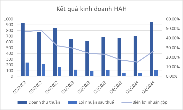 Kết thúc quý 2/2024, HAH đã ghi nhận sự tăng trưởng ấn tượng với doanh thu đạt 949 tỷ đồng, tăng 55% so với cùng kỳ năm trước. Lợi nhuận sau thuế của công ty đạt 111 tỷ đồng, tăng 15% YoY. Sự tăng trưởng mạnh mẽ này chủ yếu đến từ các mảng kinh doanh chính, bao gồm vận tải biển (+51% YoY) và khai thác cảng (+80% YoY). Các lĩnh vực này đều ghi nhận sự phát triển tích cực nhờ sự cải thiện trong hoạt động xuất nhập khẩu cũng như khối lượng hàng hóa qua cảng tại Việt Nam tăng cao. Vận tải biển, chiếm hơn 80% doanh thu của HAH, cũng hưởng lợi lớn từ sự biến động của giá cước. Trong quý 2, giá cước vận tải container toàn cầu đã tăng hơn gấp đôi so với cuối quý 1, chủ yếu do căng thẳng địa chính trị. HAH cũng cho biết giá cước vận tải trung bình của họ đã tăng 6,5% so với cùng kỳ năm ngoái. Nhờ giá cước tăng, biên lợi nhuận của HAH cũng cải thiện đáng kể, tăng 11 điểm phần trăm so với quý trước, đạt mức 26%.