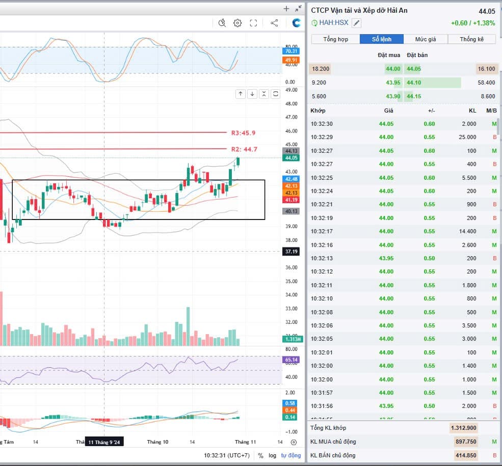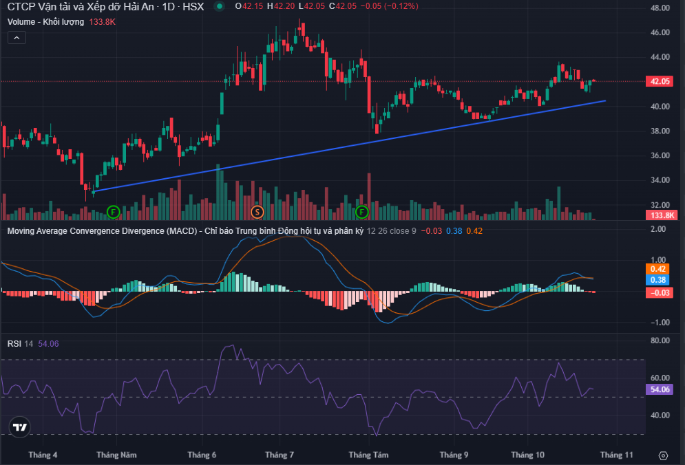 Cổ phiếu HAH đang giữ xu hướng tăng trung hạn, dù có điều chỉnh nhẹ trong ngắn hạn, nhưng chưa phá vỡ đường xu hướng tăng. Chỉ báo MACD hiện cho tín hiệu giảm, nhưng khoảng cách giữa MACD và Signal Line khá nhỏ, nghĩa là không có dấu hiệu bán tháo mạnh. Nếu MACD sớm cắt lên lại Signal Line, đây có thể là tín hiệu mua trở lại. Chỉ số RSI ở mức trung tính 54, cho thấy cổ phiếu chưa quá mua hay quá bán.