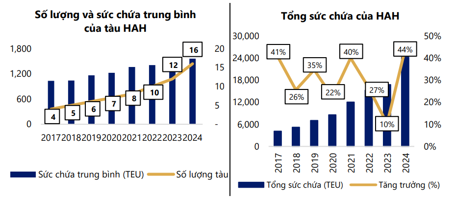 Trong tháng 2/2025, HAH đã nhận thêm 1 tàu mới với công suất 1,700 TEU, nâng đội tàu lên 17 chiếc với tổng sức chứa 28,200 TEU (+10% công suất so với hiện tại), chiếm khoảng 68% tổng sức chở của đội tàu container cả nước.