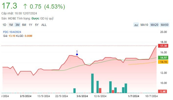 Cổ phiếu FDC đã chứng kiến nhiều phiên không có giao dịch tại vùng giá tham chiếu. Tuy nhiên, vào ngày 11/7, cổ phiếu này bất ngờ tăng kịch trần lên mức 16.550 đồng/cổ phiếu sau các giao dịch “chui”. Đến ngày 13/7, cổ phiếu FDC đã dừng lại ở mức 17.300 đồng/cổ phiếu.