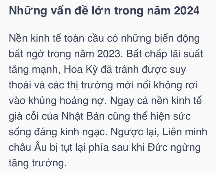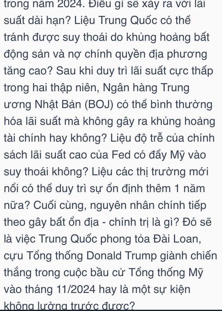 có bài nhận định rất hay Vam vừa mới đọc chia sẻ với mọi người: 2024 vẫn nhiều rủi ro thách thức nhưng ace chứng sỹ đã tôi luyện qua chu kỳ 2020-2021-2022-2023 thì năm nay sẽ vững vàng tâm lý thôi