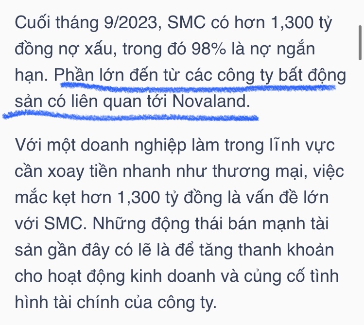 SMC phải nói là 1 case quá đáng tiếc. giá thép lên vù vù mà nó vẫn dính cục nợ ngàn tỷ chủ yếu do ông NVL. Nay NVL có lãi khủng rồi… trả nợ nhanh cho SMC thì SMC mới tung bay được =)))