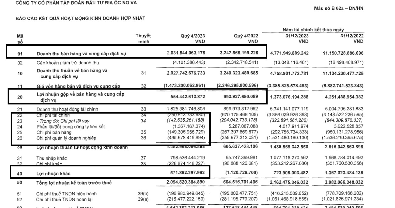 Doanh thu bán hàng giảm cộng thêm giảm giá bán nên biên lợi nhuận giảm ln gộp 554 tỷ nếu trừ đi lãi vay, các chi phí doanh nghiệp thì Novaland lỗ ngược khoảng gần 300 tỷ cũng tương tự quý 3.