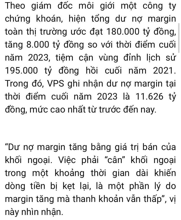 Dư nợ margin đang cao khủng khiếp nhưng tiền vào TT k tăng. vì sao? tiền margin dùng để cân hàng ngoại bán ra đợt cuối năm.