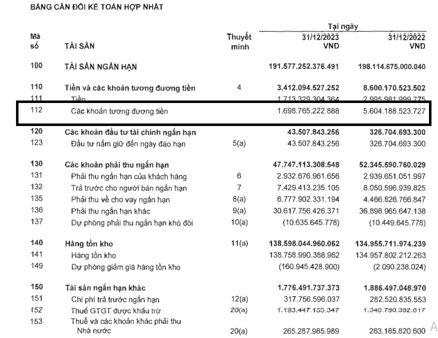 Tiền giảm mạnh → Cũng hợp lý với doanh nghiệp nợ lớn khủng điều này cũng thể hiện doanh nghiệp đã giảm nợ dc hơn 8k tỷ