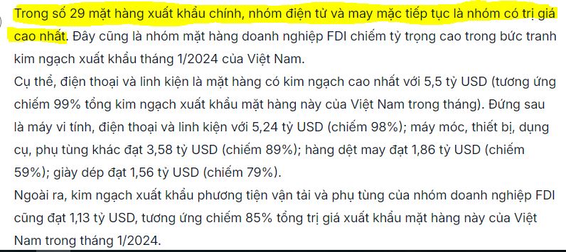 tuy nhiên cá nhân Vam vẫn chú ý quan sát kỹ tỷ giá USD/VND và nếu tỷ giá tiếp tục tăng thì ưu tiên số 1 là dòng hàng lợi thế xuất khẩu. chủ lực của Vam đoạn này vẫn là thủy sản - công nghệ đặc biệt công nghệ vì xuất khẩu công nghệ chiếm tỷ trọng lớn nhất trong nguồn vốn FDI