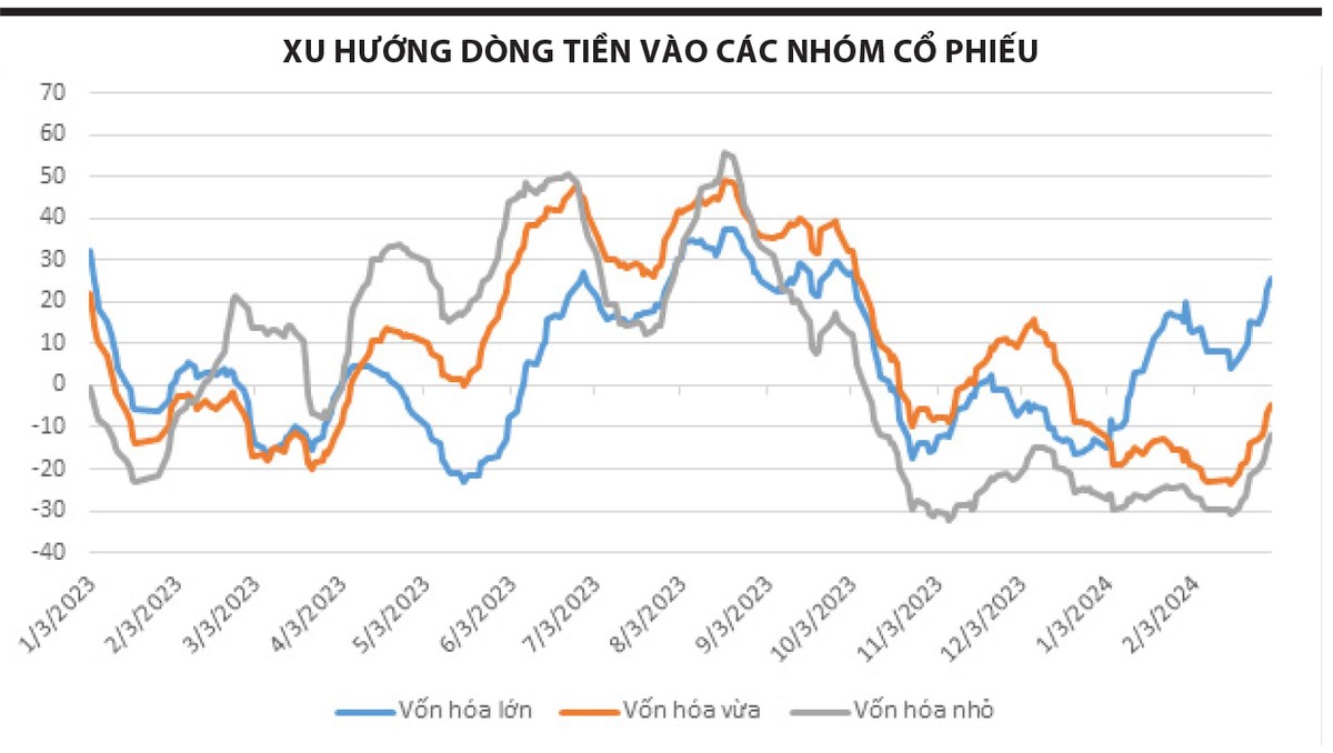 như Vam nói tuần trước dòng tiền đang có xu hướng luân chuyển dòng từ nhóm vốn hoá lớn sang nhóm vốn hoá vừa & nhỏ. nhìn đồ thị bên dưới ta có thể thấy nhịp từ sau Tết ta đến cuối tháng 2 dòng blu và Vn30 tăng nóng thì nay hạ nhiệt, nhường sân khấu cho 2 nhóm bên dưới tiếp tục diễn (nhóm đường cam diễn trước nhóm đường xám theo đuôi)