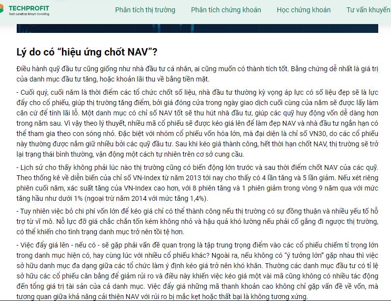“Ngày 31/12 là thời điểm nhiều quỹ đầu tư sẽ chốt giá trị tài sản ròng (NAV) trong một năm hoạt động của mình. Hiệu suất đầu tư sẽ được “đo đạc” bằng cách so sánh NAV của 31/12 năm nay với cùng kỳ năm trước. Cũng từ điều này mà nhiều năm nay giả thiết “chốt NAV” cuối năm luôn được nhắc đến”