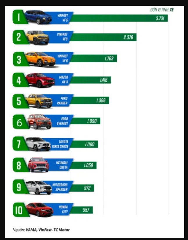 VinFast nắm trọn 3 vị trí dẫn đầu TOP 10 ôtô bán chạy nhất tháng 4/2025
