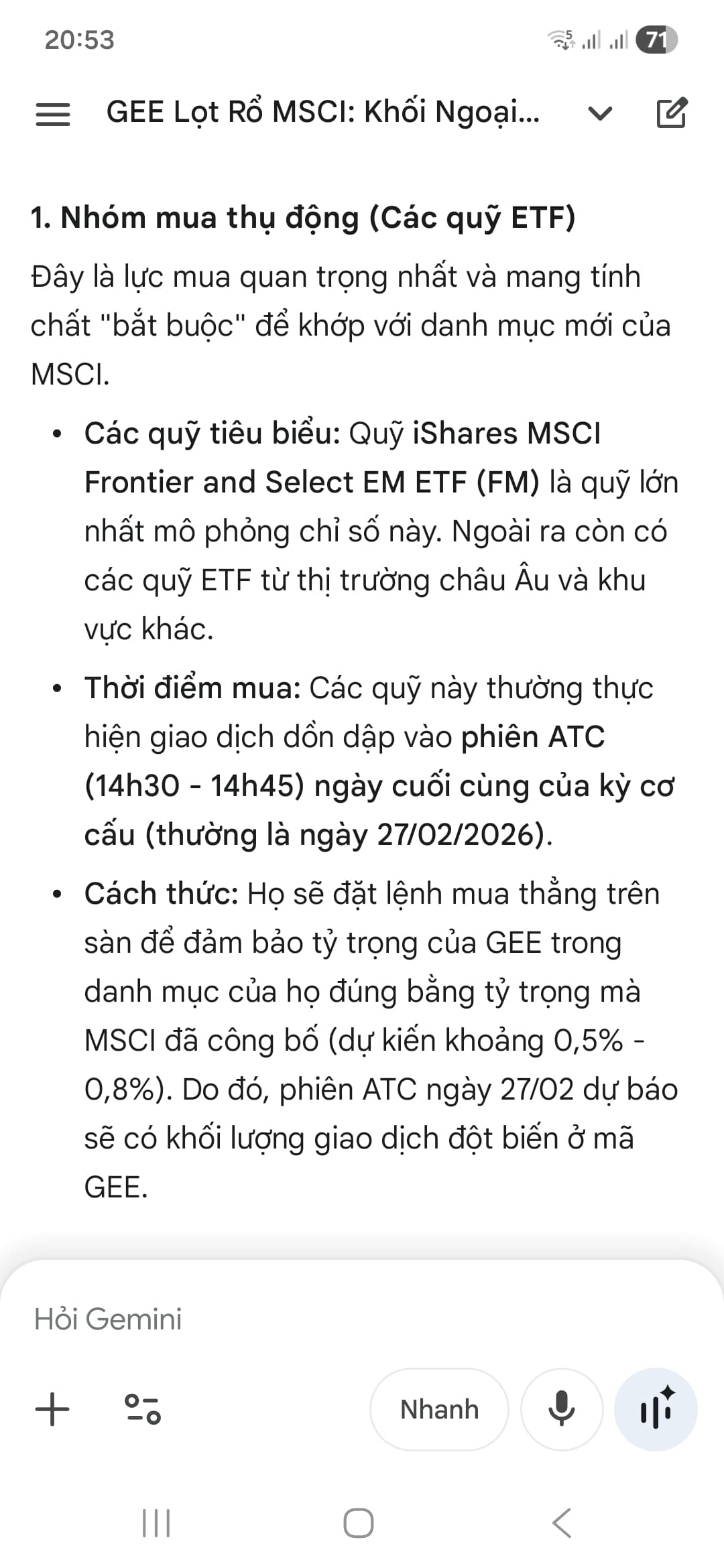 Gee lọt rổ MSCI quỹ ngoại sẽ mua tự động 5 đến 7 triệu cp GEE. 27/2 hoàn tất cơ cấu,1/3 có hiệu lực