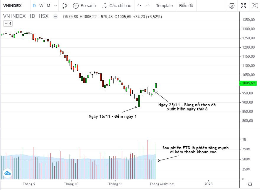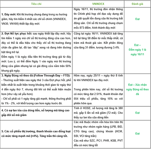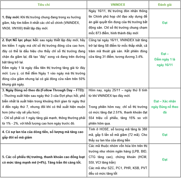 Dựa theo bảng đánh giá trên, VNINDEX đã chính thức Xác nhận có “Ngày bùng nổ theo đà” vào ngày 25/11/2022 – với bản chất của “Ngày bùng nổ theo đà” là ngày giao dịch có sự bùng nổ, lan tỏa cho toàn thị trường, kích hoạt cho một thị trường tăng giá mới. Em đánh giá rằng chúng ta có đủ cơ sở để tin vào đợt phục hồi mạnh mẽ lần này của VNINDEX, và đây là thời điểm để chúng ta tự tin giải ngân để lựa chọn được những cơ hội tốt.