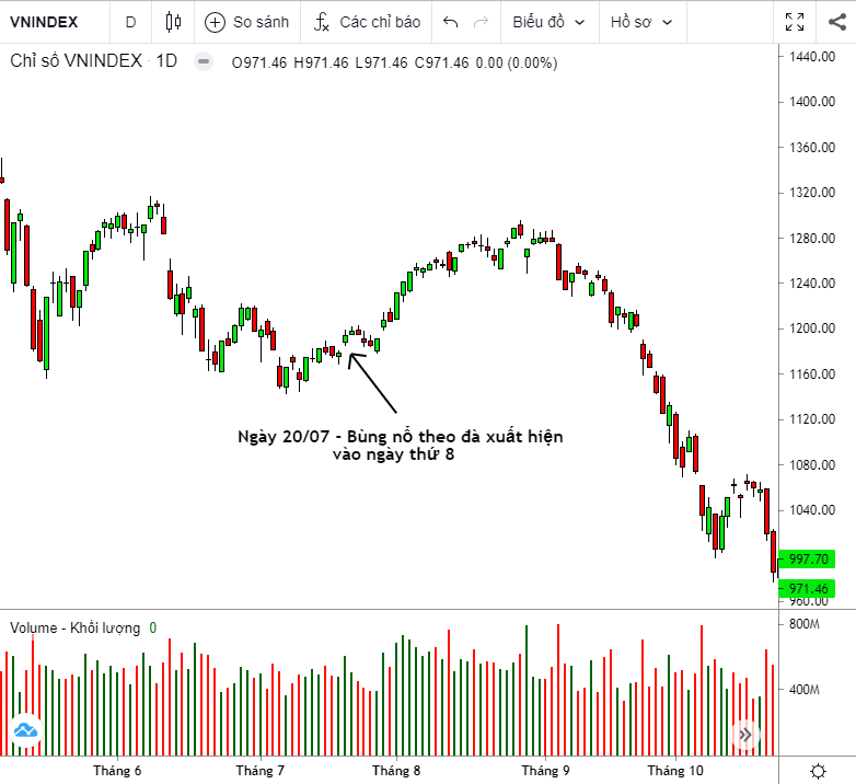 Thật ra, tín hiệu bùng nổ theo đà lần này không khó để tìm thấy trên thị trường. Và nó đã từng xuất hiện vào ngày 20/07/2022 – cũng là ngày thứ 8 kể từ ngày nỗ lực phục hồi đầu tiên. Và diễn biến VNIndex thời điểm đó, thị trường đã có một nhịp tăng kéo dài gần 2 tháng để NĐT có thể tìm kiếm cơ hội cho mình.