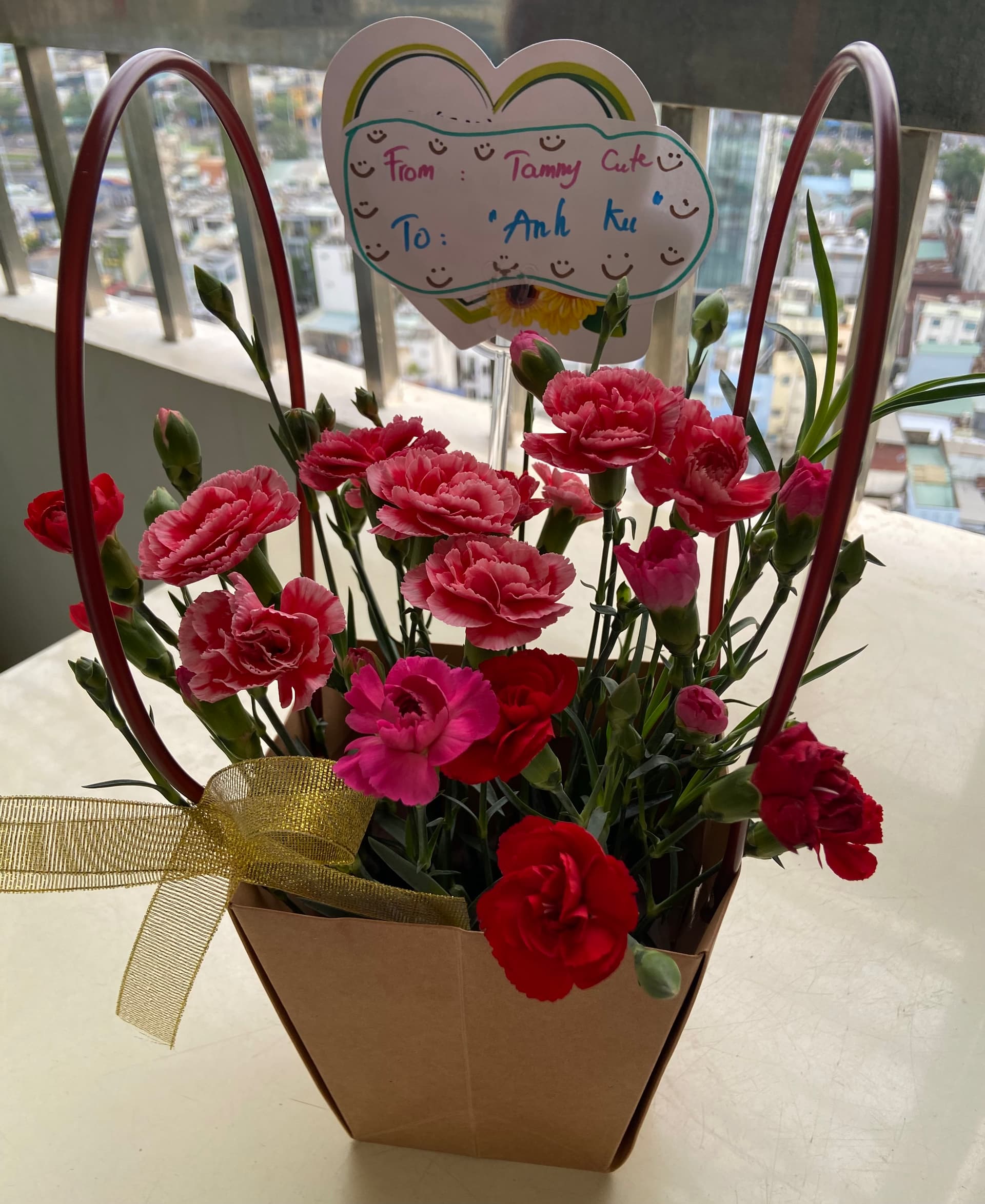 Giỏ hoa này đẹp quá lady, cô giáo con chị cũng khuyến khích các con tự làm thiệp và hoa.